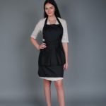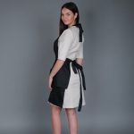 Tablier de taille universelle, de couleur noire, fabriqué en tissu imperméable imprégné. Avec poches plaquées sur le devant sous les volants.