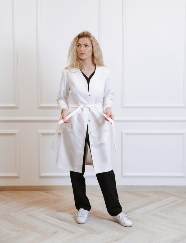 Chalatas su kišenėmis, spaudėmis ir reguliuojama juosta nugaroje.