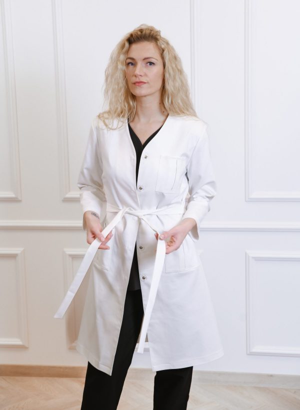 Pastaba: Šis chalatas yra 6 cm didesnis nei kiti to paties dydžio darbo drabužiai, užtikrinant papildomą patogumą.