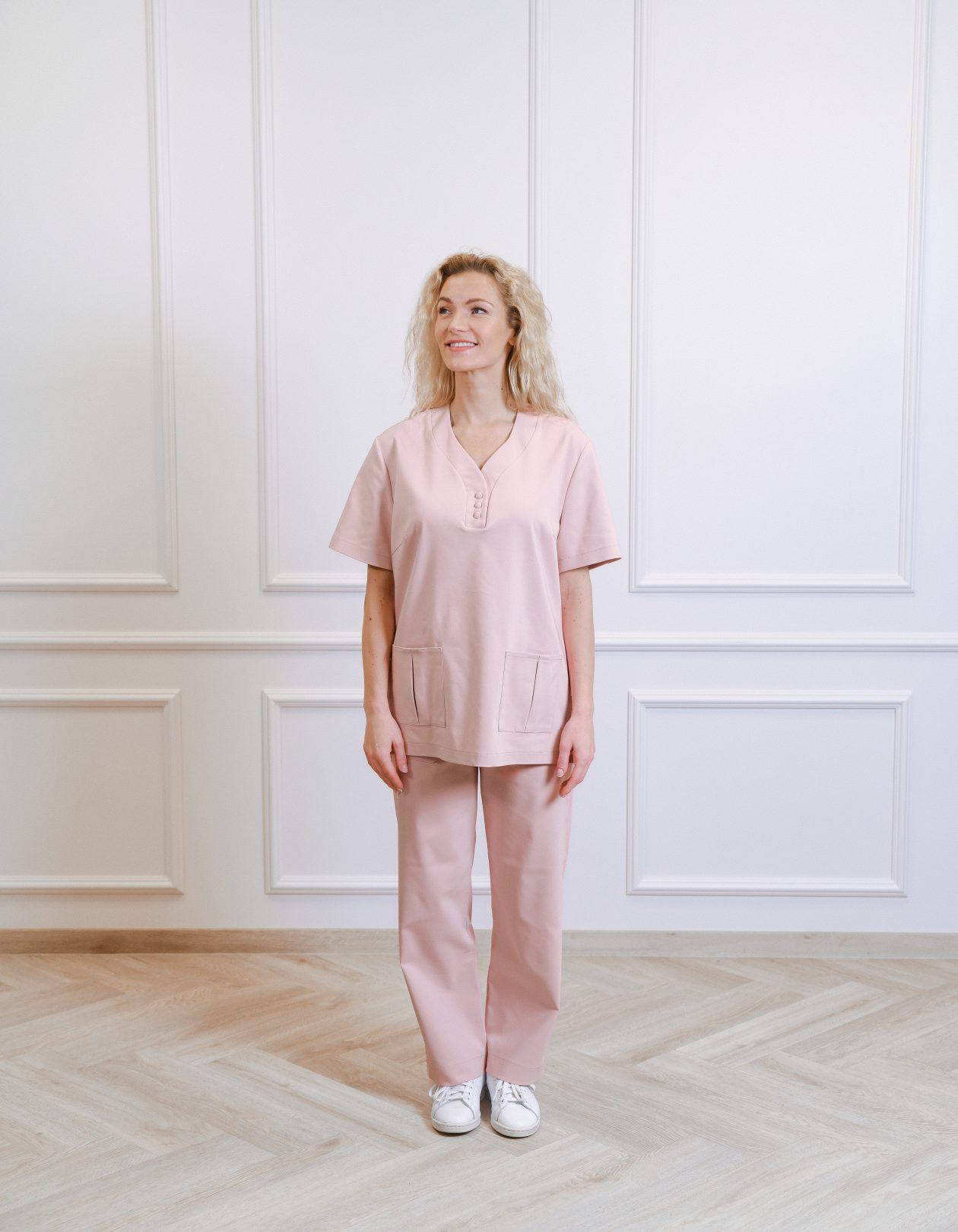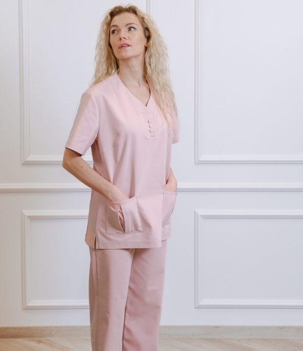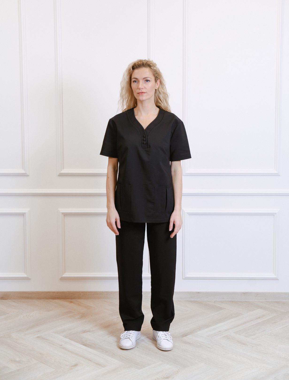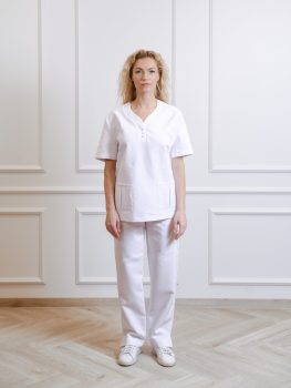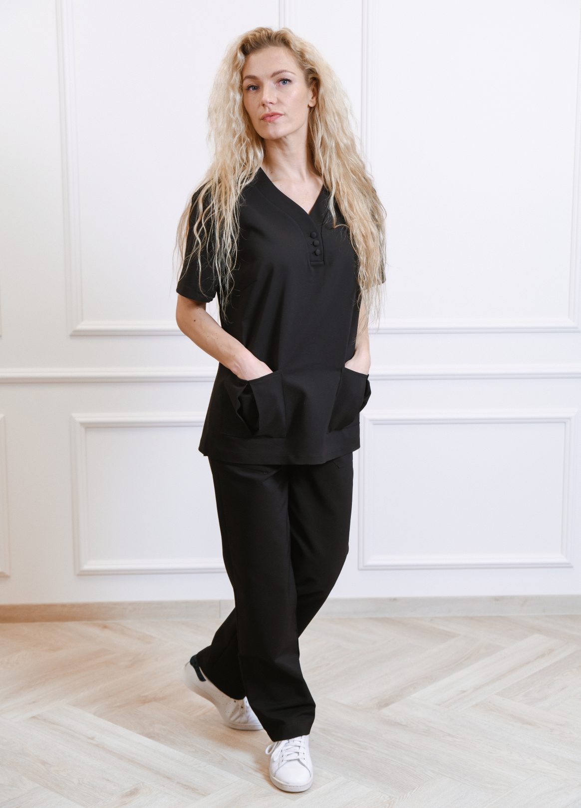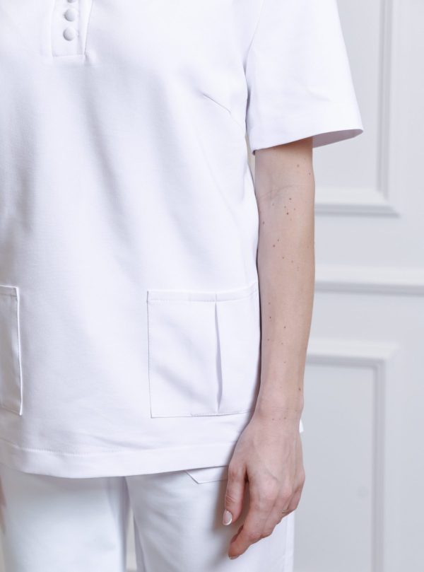 Marškinių trumpomis rankovėmis su kišenėmis bei sagomis ir tiesaus kirpimo kelnėmis su virvele ir kišenėmis komplektas.