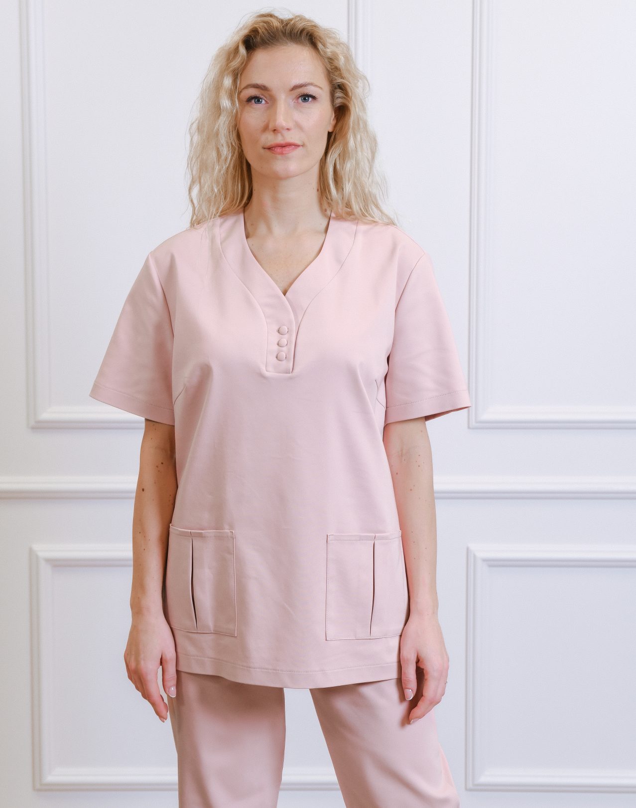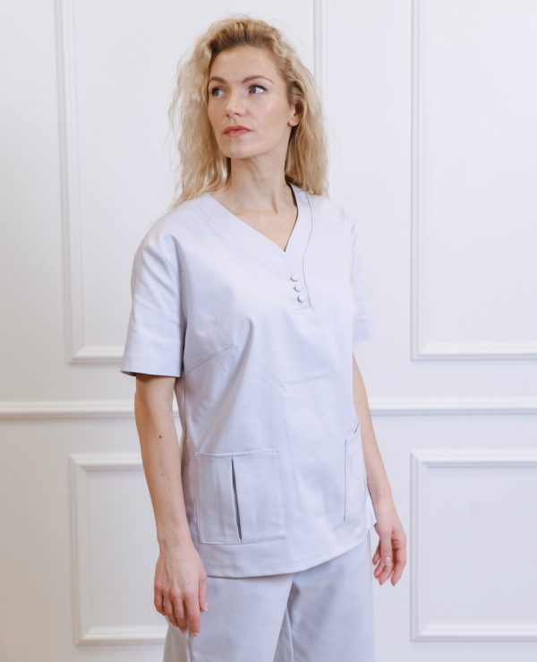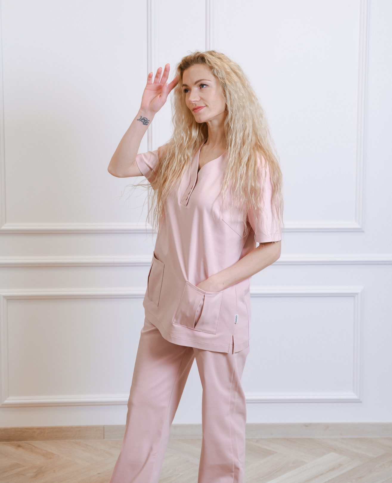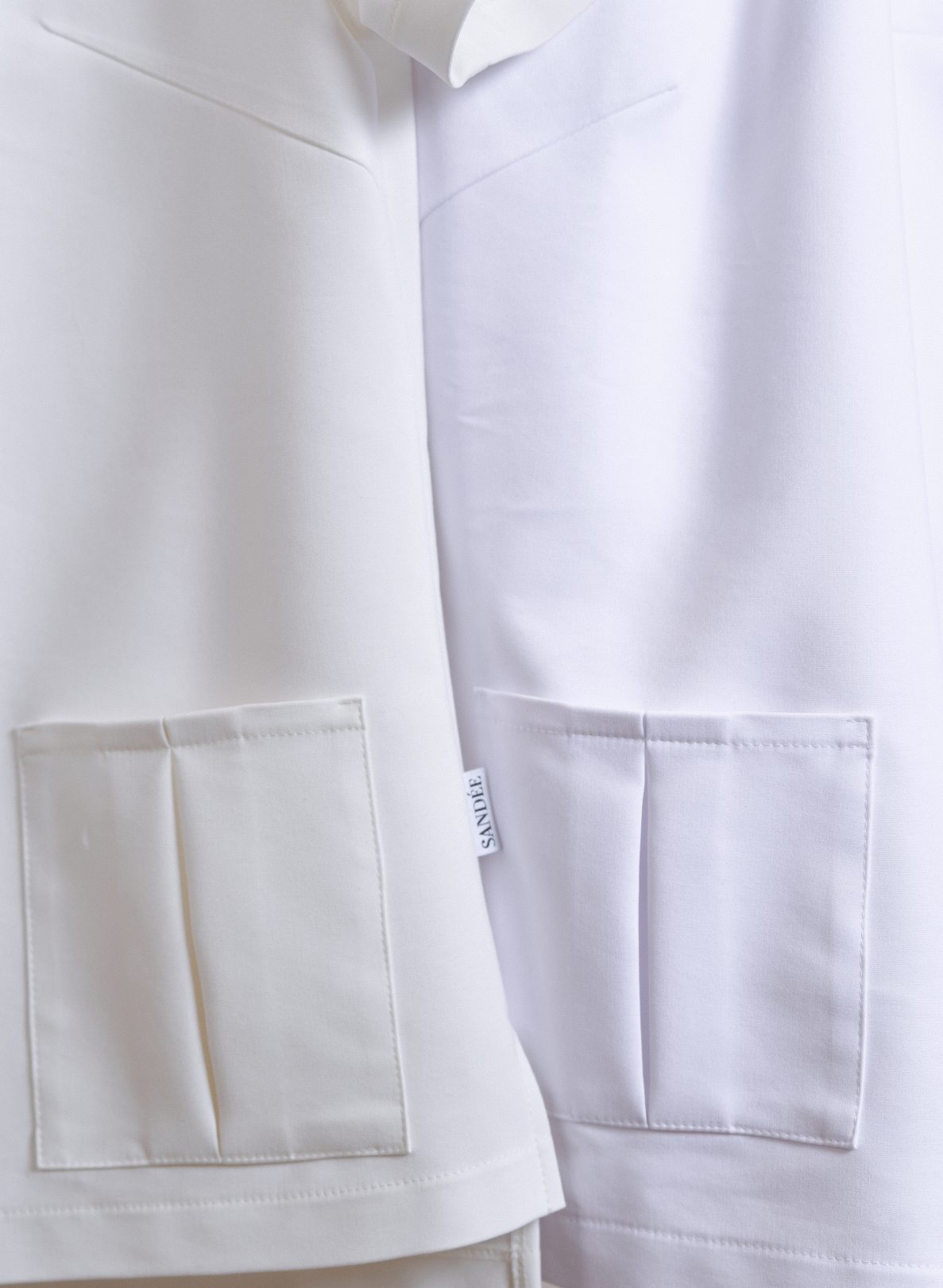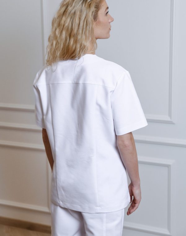 Marškinių trumpomis rankovėmis su kišenėmis bei sagomis ir tiesaus kirpimo kelnėmis su virvele ir kišenėmis komplektas.