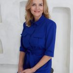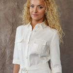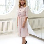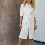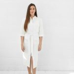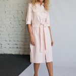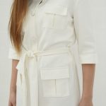 Marškinių tipo midi suknelė su sagomis ir kišenėmis sujuosiama dirželiu.
