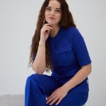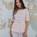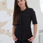 Švarkas su sagomis ir kišenėmis, sujuosiamas diržu per juosmenį, rankovės iki alkūnių.