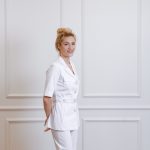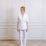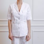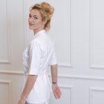 Švarkas su sagomis ir kišenėmis, susegamu diržu per juosmenį, rankovės iki alkūnių.