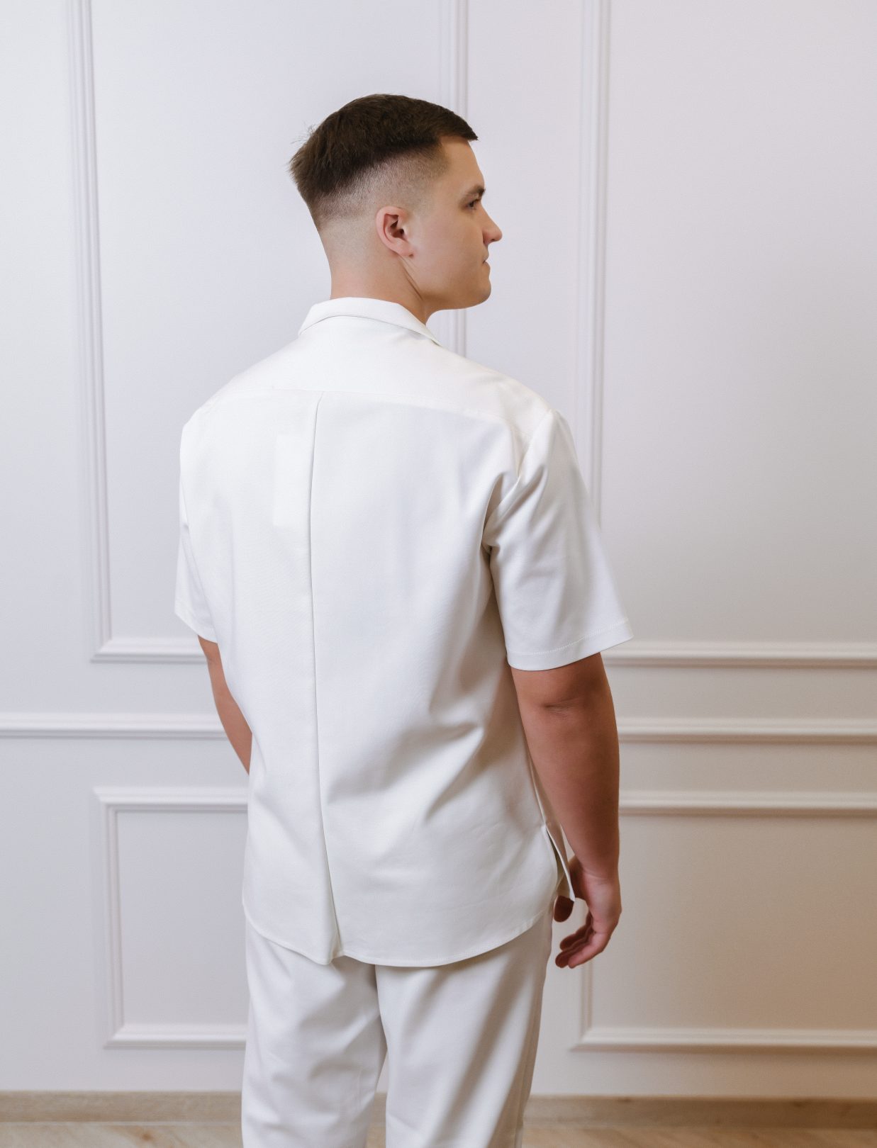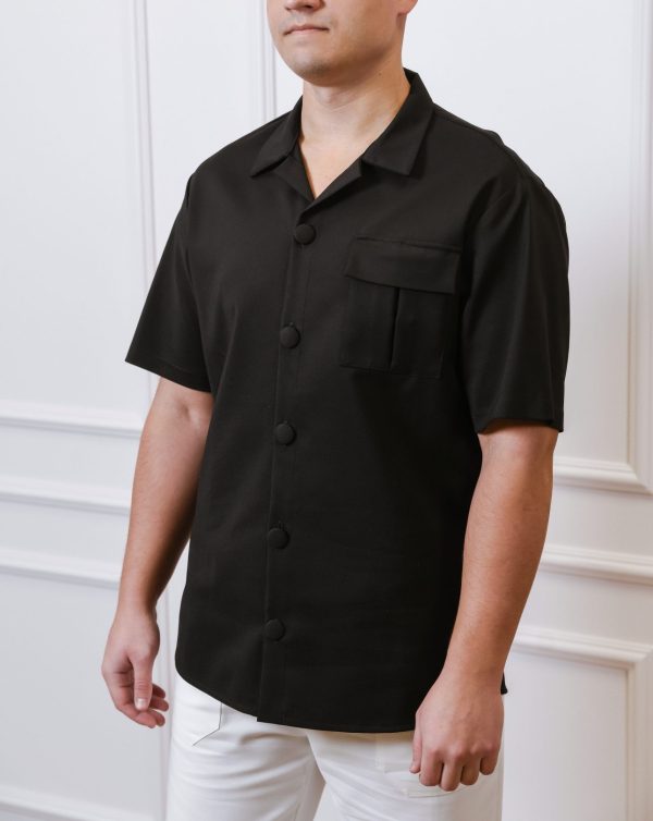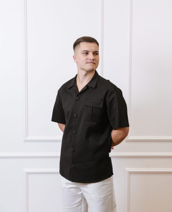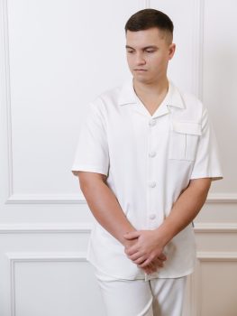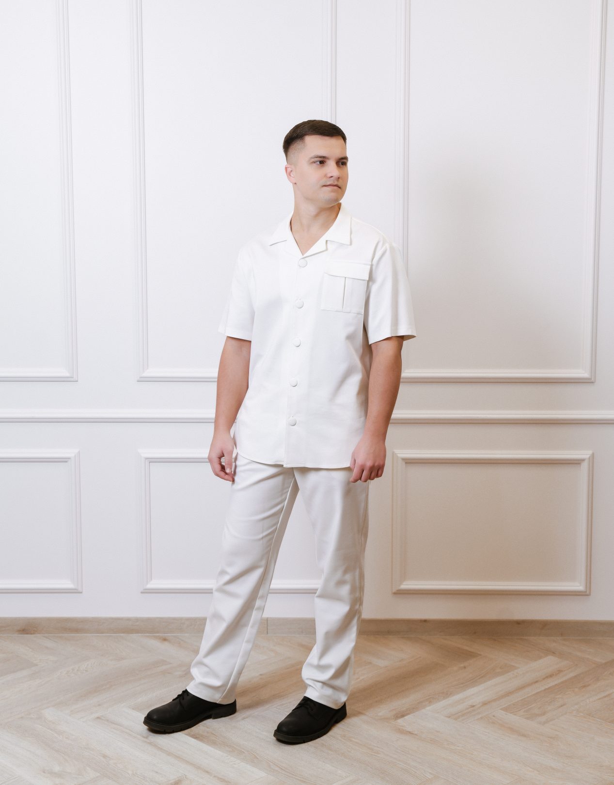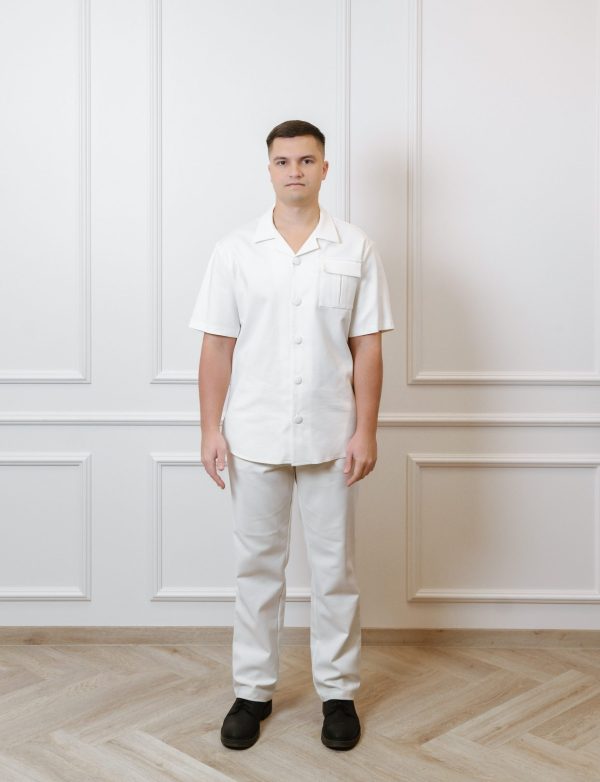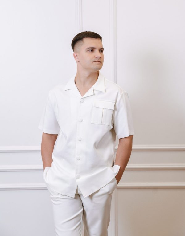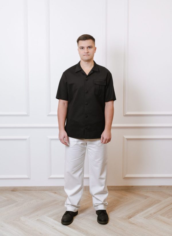 Vyriškų marškinių trumpomis rankovėmis su kišenėmis ir plataus kirpimo kelnių komplektas.