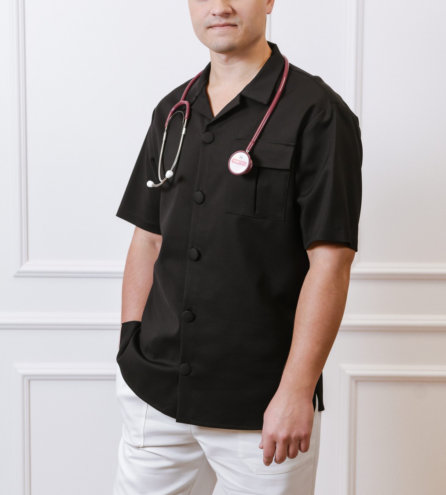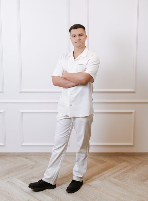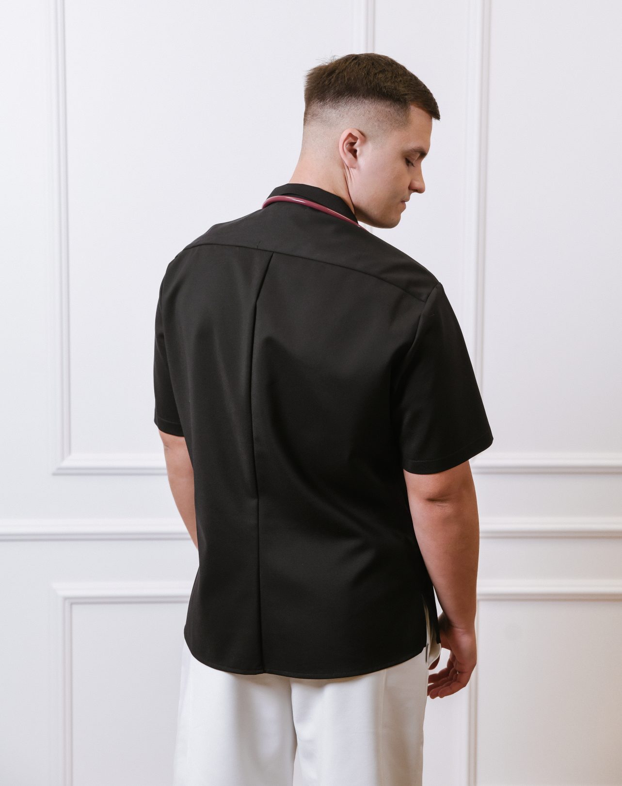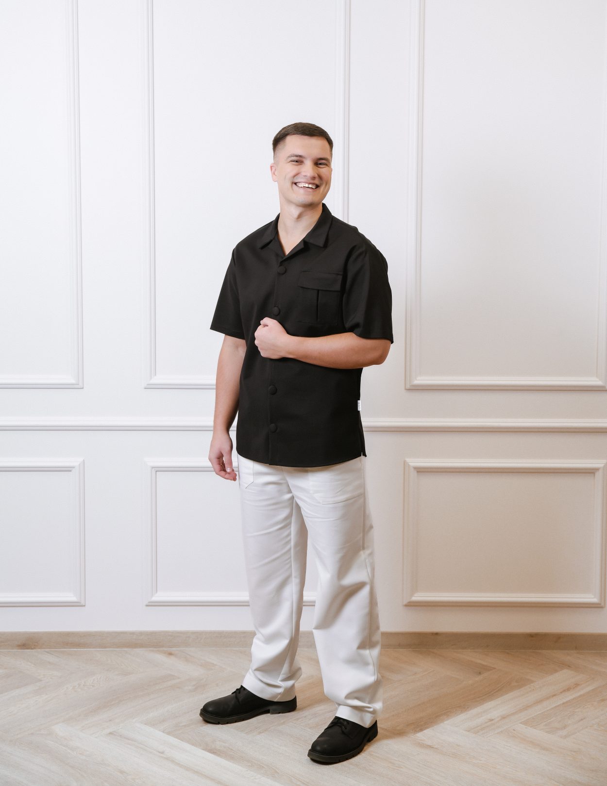 Vyriškų marškinių trumpomis rankovėmis su kišenėmis ir plataus kirpimo kelnių komplektas.