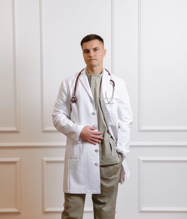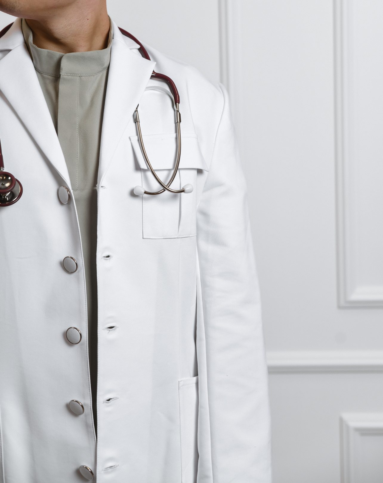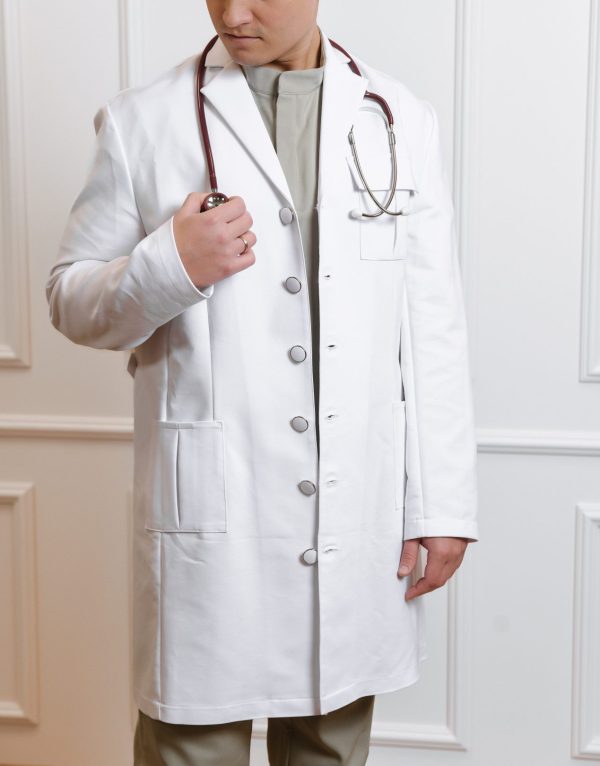 Robe with pockets, buttons, and an adjustable belt at the back.