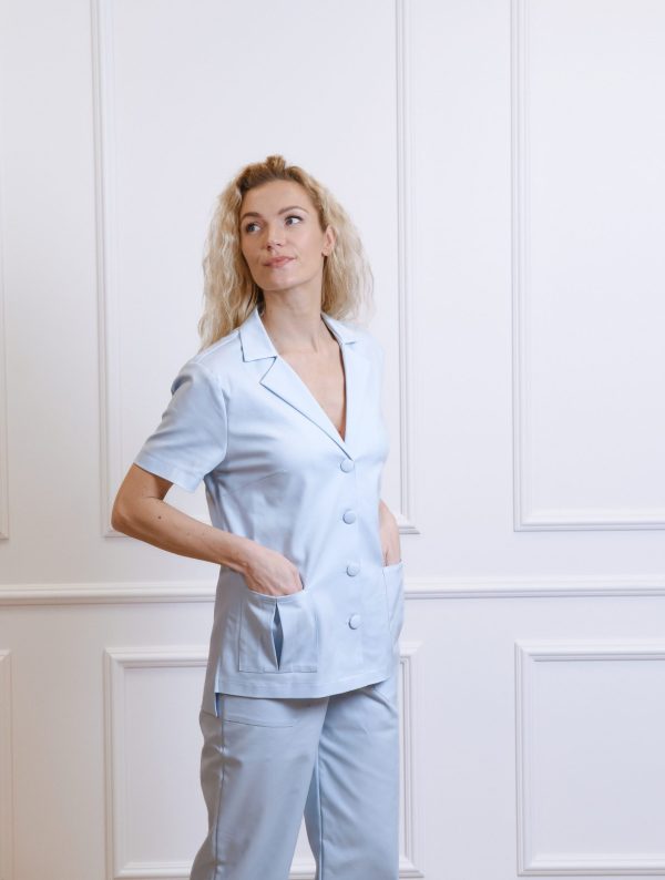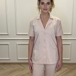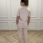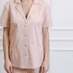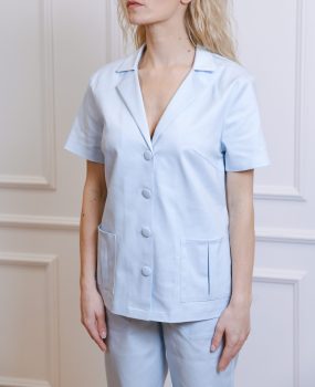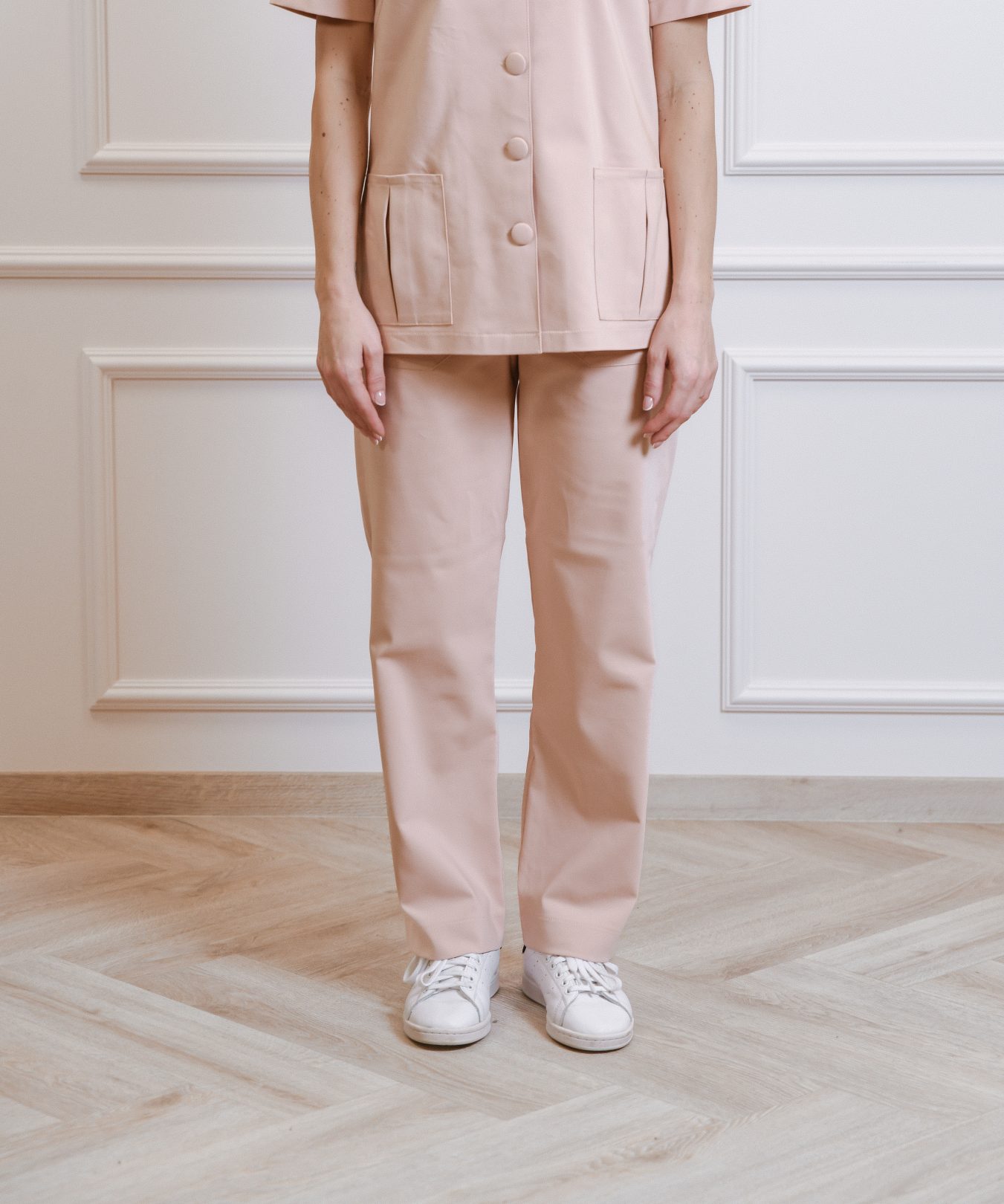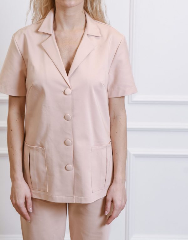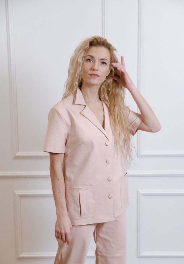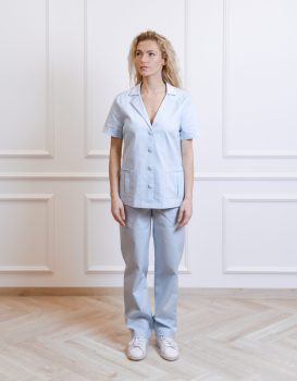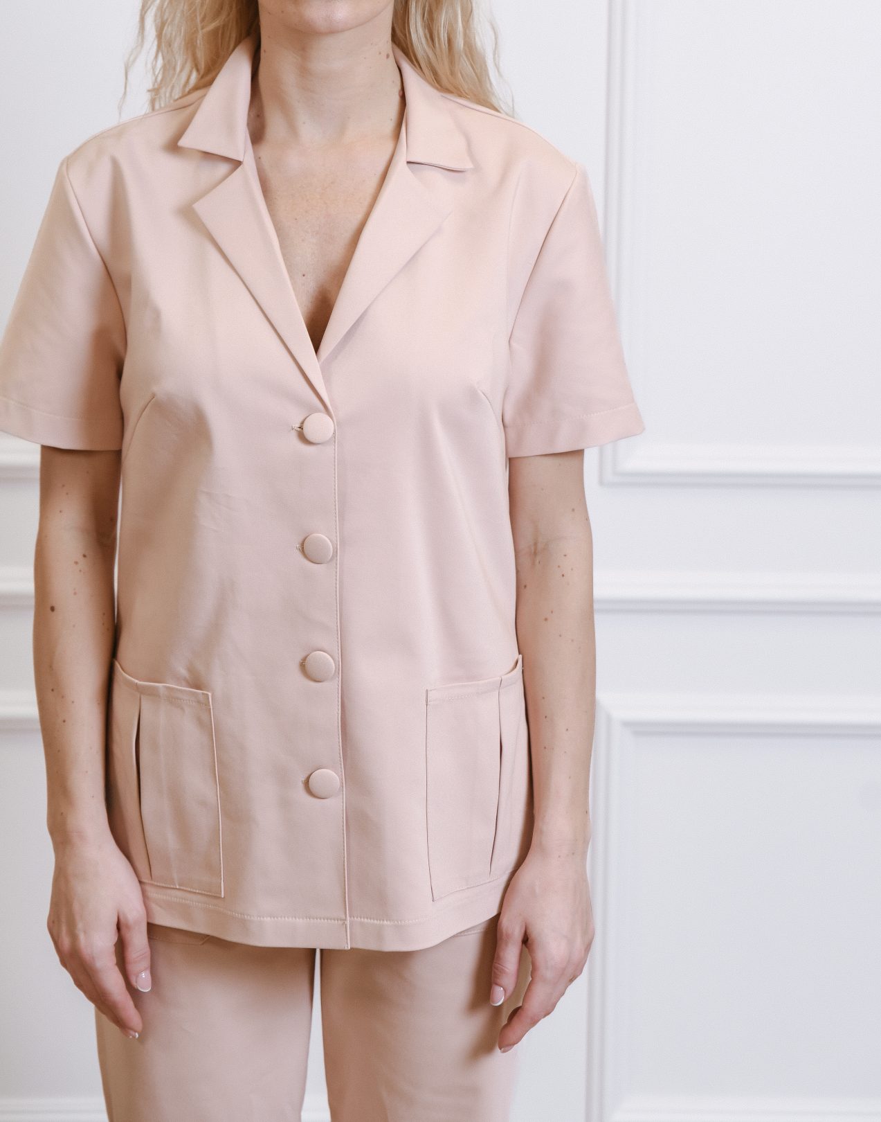 Short-sleeved shirt with pockets and straight-cut pants with a drawstring and pockets set.