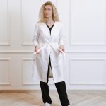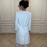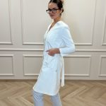 Robe with pockets, snaps, and an adjustable belt at the back.